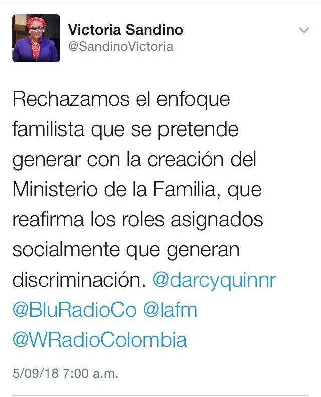 La decisión de crear un  Ministerio de la Familia, proyecto que fue presentado a la Cámara de Representantes el pasado mes de Agosto ha generado que varios sectores la rechace como el caso de la terroristas y proxeneta de las FARC, alias “Victoria Sandino”, encargada de reclutar forzosamente mujeres para después callar sus violaciones.