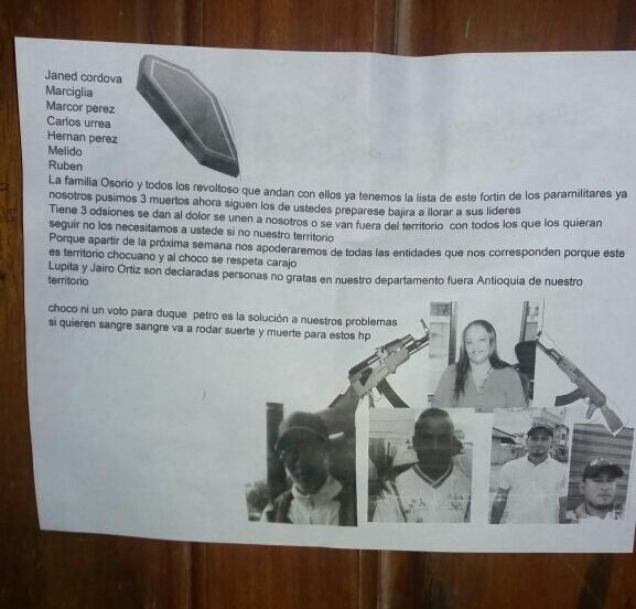 En las últimas horas se ha conocido, a través de redes sociales, amenazas en el Chocó, concretamente en el municipio de Belén de Bajira, recientemente dado a este departamento, a quienes voten por el candidato del Centro Democrático, Iván Duque, e invitando a votar por el candidato y exalcalde de Bogotá, Gustavo Petro.