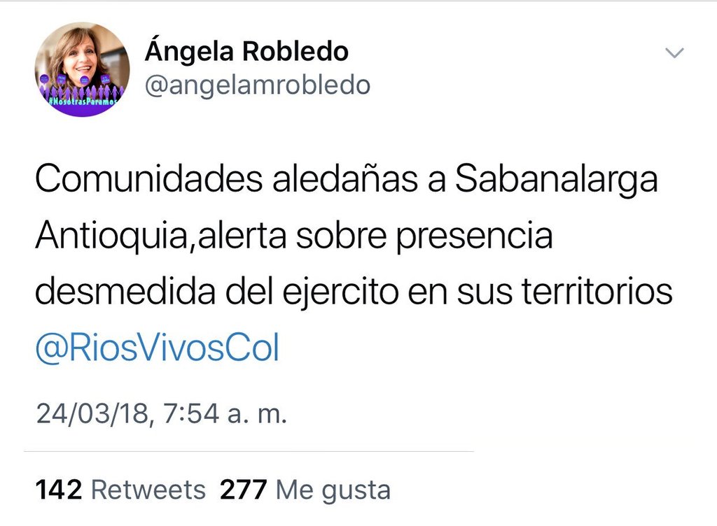 Textualmente, expresaría a través de su perfil oficial en Twitter que, "Comunidades aledañas a Sabanalarga Antioquia, alerta sobre presencia desmedida del Ejército en sus territorios".