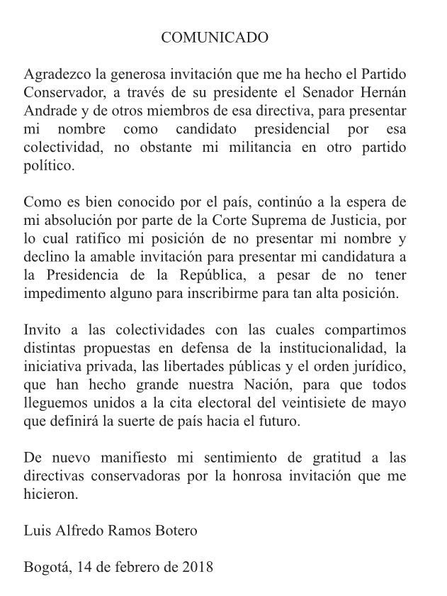 Aunque en el comunicado, el exgobernador Ramos menciona que declina la invitación hecha por el partido Conservador, se menciona allí mismo que esta decisión estaría justificada por la espera de la absolución de la Corte Suprema.