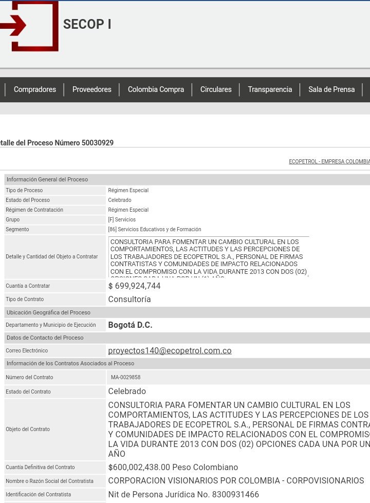 Para el caso del contrato firmado con el DANE, se revelaría que este se había contratado por un valor de $47 millones de pesos, seguido otro contrato firmado por la suma de $699 millones  de pesos con ECOPETROL, para el desarrollo de una “consultoría” para impulsar un "cambio cultural en los comportamientos, actitudes y percepciones de los trabajadores, contratistas y comunidades, de impactos relacionados con el compromiso con la vida”.